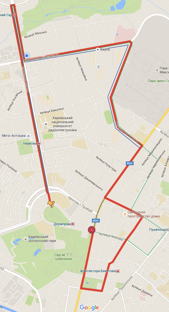 Старт - площадь Свободы -> проспект Науки -> ул. О.Яроша –> проспект Науки –> ул. Новгородская -> ул. Динамовская -> ул. Сумская -> ул. Ярослава Мудрого -> ул. Алчевских -> ул. Чернышевская -> ул. Скрыпника -> ул. Сумская -> площадь Свободы - Финиш